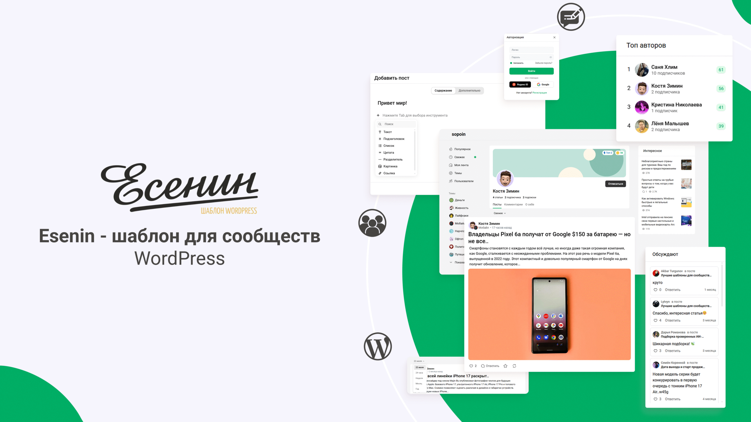 Esenin — премиум шаблон WordPress, который предназначен как для ведения личных блогов, так и для крупных сообществ. Основной функционал: